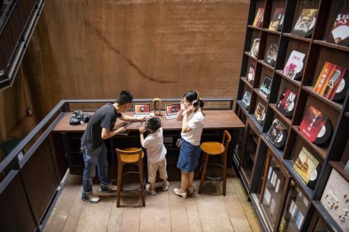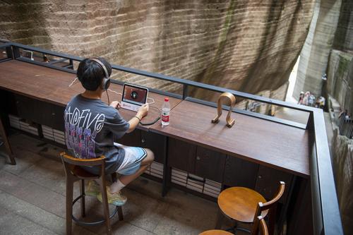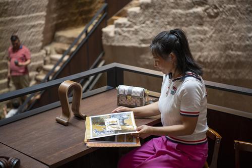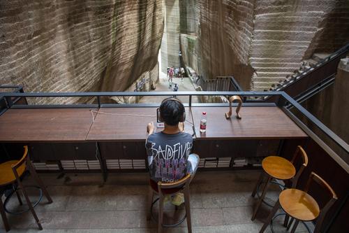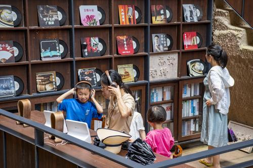 2023年6月11日,位于浙江省丽水市缙云县仙都景区的“浙江图书馆·岩宕书房”里,游客坐在洞中书房聆听或阅读,感受别样的书香文韵。