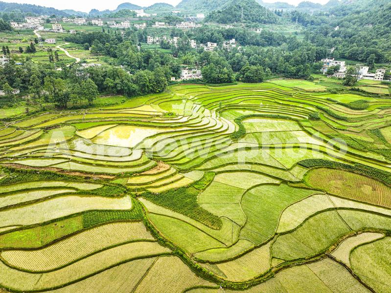 图片说明:2023年6月12日,贵州省黔西市雨朵镇雨朵社区,梯田层层叠叠色彩斑斓,阡陌纵横,田垄交错,勾画出一幅初夏稻秧开叶生机盎然的田园风光。