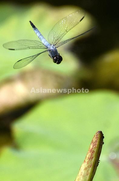 图片说明:6月12日,在河北省邯郸市龙湖公园荷塘里,蜻蜓飞落在荷叶上。