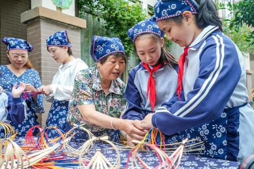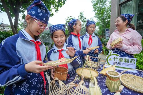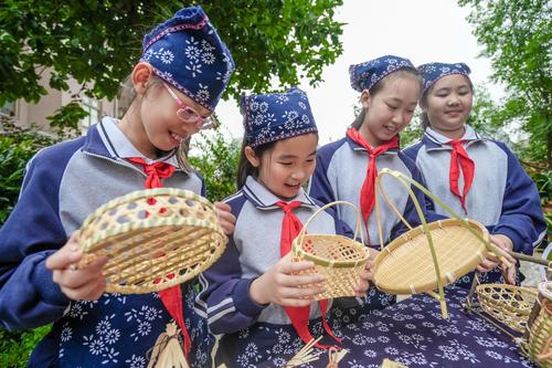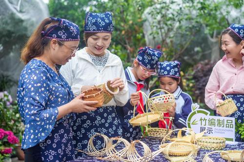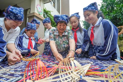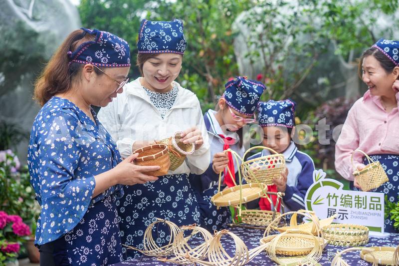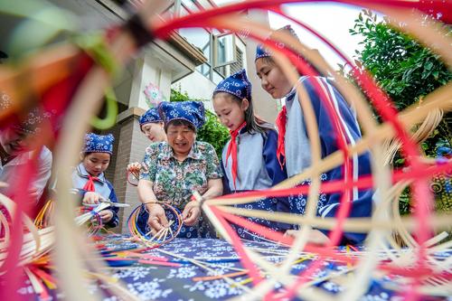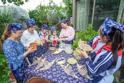 2023年6月10日,文化和自然遗产日,浙江省湖州市长兴县太湖图影文化站联合妇联开展“探寻非遗竹编技艺”活动,当地妇女和孩子在竹编手艺人的指导下学习传统的竹篾编制技艺和塑形技法,制作妙趣横生的竹编作品,感受传统非遗文化的独特魅力。