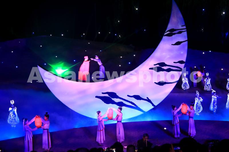 2023年6月13日晚,演员在大型沙漠实景剧《敦煌盛典》中表演。