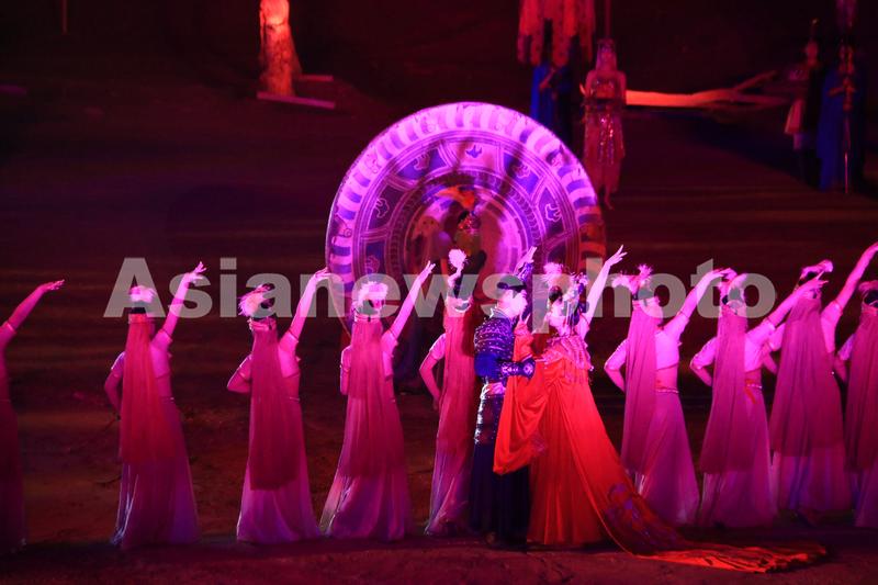 2023年6月13日晚,演员在大型沙漠实景剧《敦煌盛典》中表演。