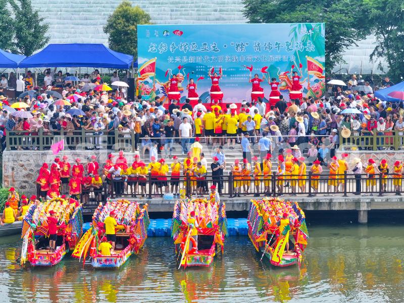 图片说明:2023年6月16日,浙江省湖州市长兴县洪桥镇七斗漾,来自长兴县洪桥镇橡树下村,中道村和金星村共四支花龙船队劈波新浪、奋力划奖,上演了一场水上版“速度与激情”,迎接传统节日端午节的到来。