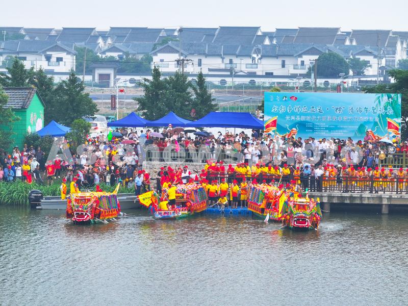 图片说明:2023年6月16日,浙江省湖州市长兴县洪桥镇七斗漾,来自长兴县洪桥镇橡树下村,中道村和金星村共四支花龙船队劈波新浪、奋力划奖,上演了一场水上版“速度与激情”,迎接传统节日端午节的到来。