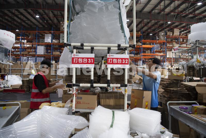 图片说明:2023年6月16日,在浙江省金华市金义综合保税区京东仓内,工人们忙着“6·18”电商活动中售卖的跨境商品分拣、打包、发货。