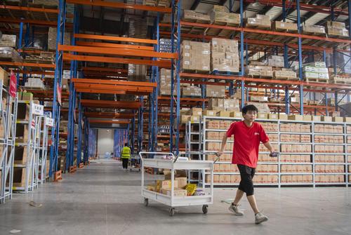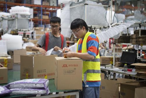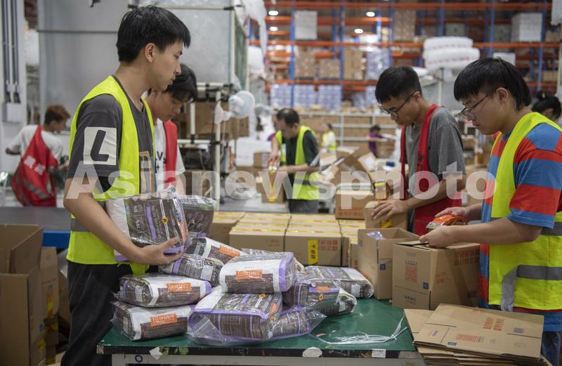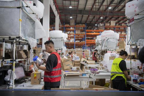 图片说明:2023年6月16日,在浙江省金华市金义综合保税区京东仓内,工人们忙着“6·18”电商活动中售卖的跨境商品分拣、打包、发货。