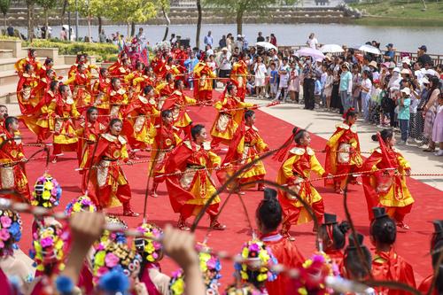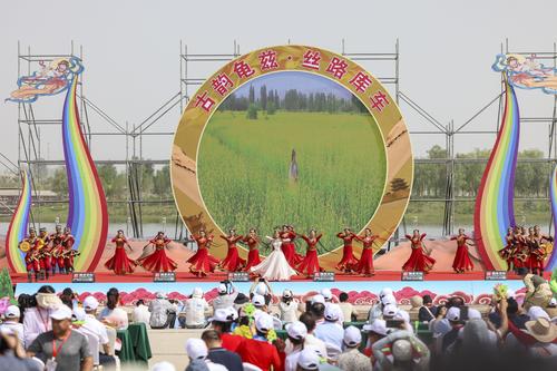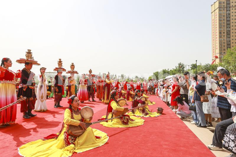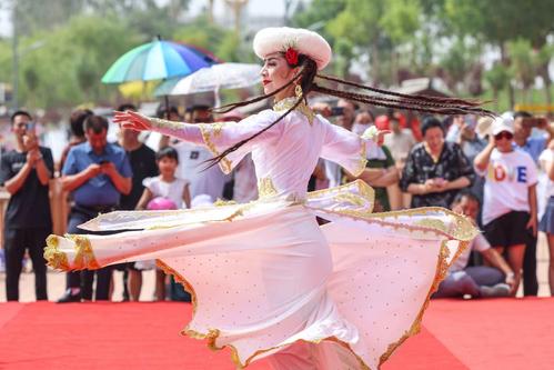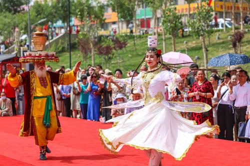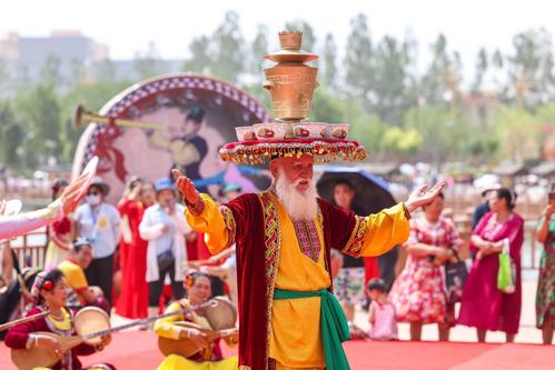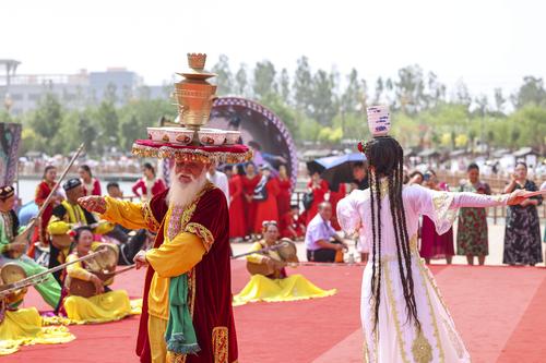 2023年6月17日,第十九届多浪龟兹文化旅游节现场,民间艺人表演萨玛瓦尔舞和顶碗舞。当日,2023年阿克苏地区第十九届多浪龟兹文化旅游节暨库车市第二届龟兹文化艺术节开幕式在新疆阿克苏地区库车市东湖广场举行。袁欢欢/for china daily