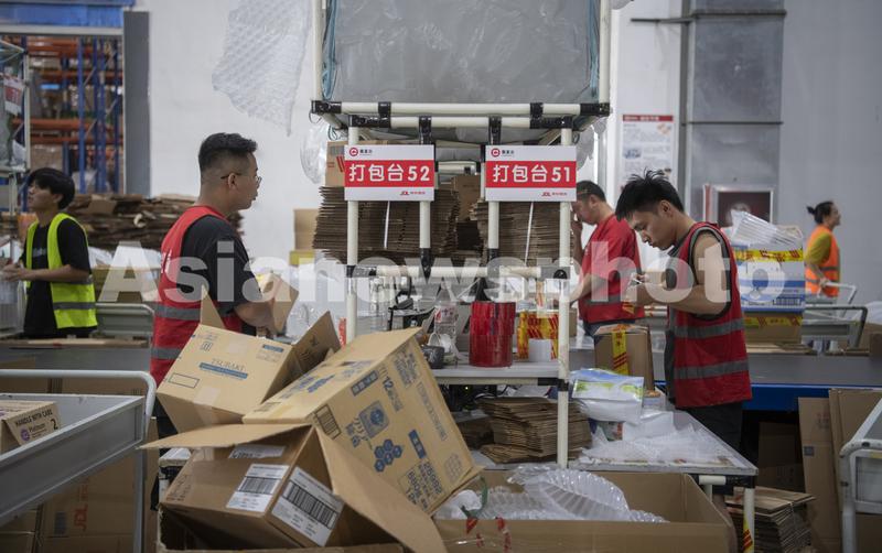 图片说明:2023年6月16日,在浙江省金华市金义综合保税区京东仓内,工人们忙着“6·18”电商活动中售卖的跨境商品分拣、打包、发货。
