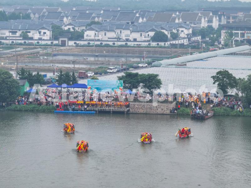 图片说明:2023年6月16日,浙江省湖州市长兴县洪桥镇七斗漾,来自长兴县洪桥镇橡树下村,中道村和金星村共四支花龙船队劈波新浪、奋力划奖,上演了一场水上版“速度与激情”,迎接传统节日端午节的到来。
