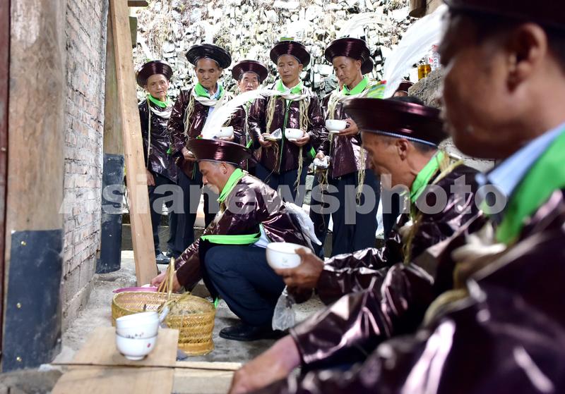 6月17日,鼓藏师在贵州省黔东南苗族侗族自治州从江县加勉乡加模村苗族同胞举行26年一度的鼓藏节祭祖活动上祭祀祖先。