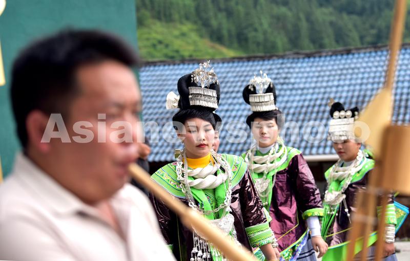 6月17日,苗族同胞在贵州省黔东南苗族侗族自治州从江县加勉乡加模村举行26年一度的鼓藏节祭祖活动上踩歌堂。