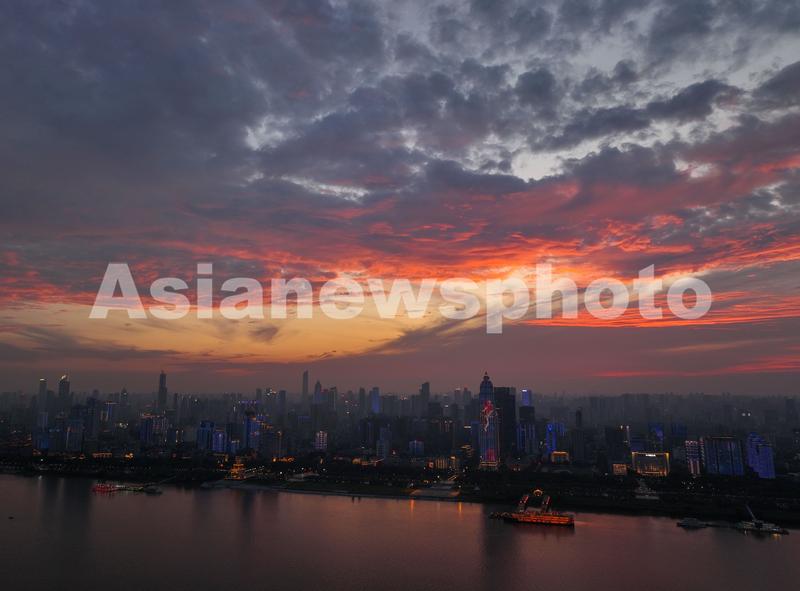 图片说明:这是6月19日傍晚在武汉市武昌区江滩拍摄的彩霞满天、绚丽多彩美景(无人机照片)。