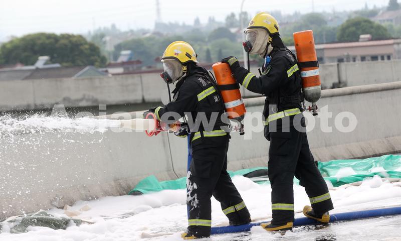 图片说明:2023年6月19日,湖嘉地区“迎亚运、保安全”高速公路突发事件应急演练现场,参加应急演练的救援人员使用泡沫持续进行覆盖,掩护救援。