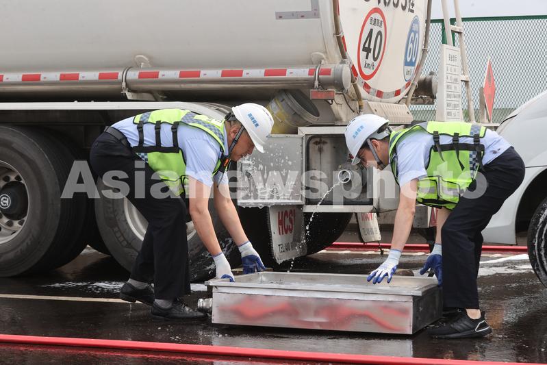 图片说明:2023年6月19日,湖嘉地区“迎亚运、保安全”高速公路突发事件应急演练现场,参加应急演练的救援人员对危化品车辆进行险情处置。