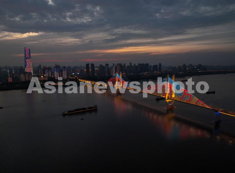 图片说明:这是6月19日傍晚在武汉市武昌区江滩拍摄的彩霞满天、绚丽多彩美景(无人机照片)。