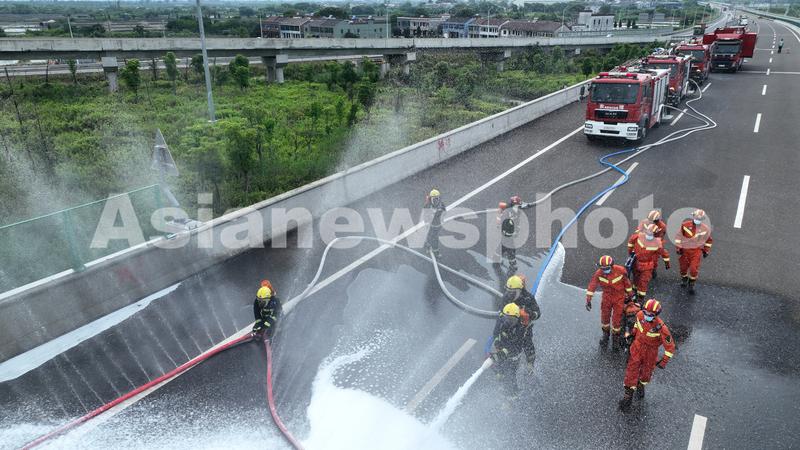 图片说明:2023年6月19日,湖嘉地区“迎亚运、保安全”高速公路突发事件应急演练现场,参加应急演练的救援人员使用泡沫持续进行覆盖,掩护救援。
