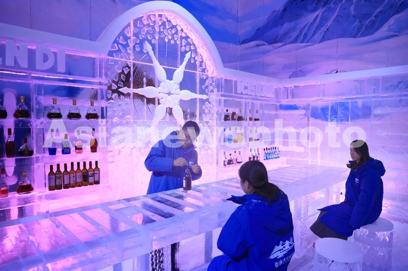 图片说明:2023年6月21日,游客在江苏南通森迪冰雪乐园“冰酒吧”体验。