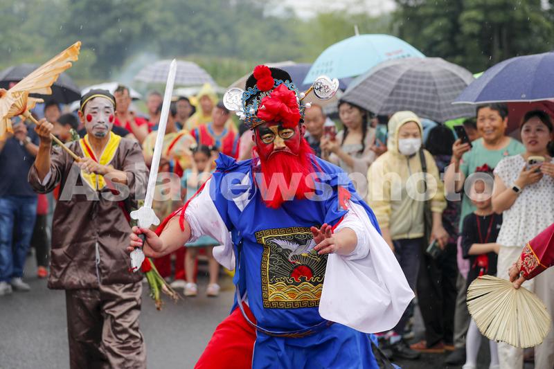 图片说明:2023年6月22日,民俗艺人在黄山市徽州区岩寺镇上朱村表演非遗民俗“跳钟馗”。