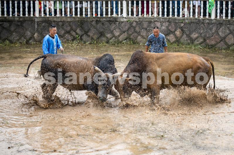图片说明:2023年6月22日,浙江省金华市婺城区雅畈镇铜山斗牛场里,在阵阵呐喊和锣鼓声中,两头黄牛四角相抵,奋力争斗。