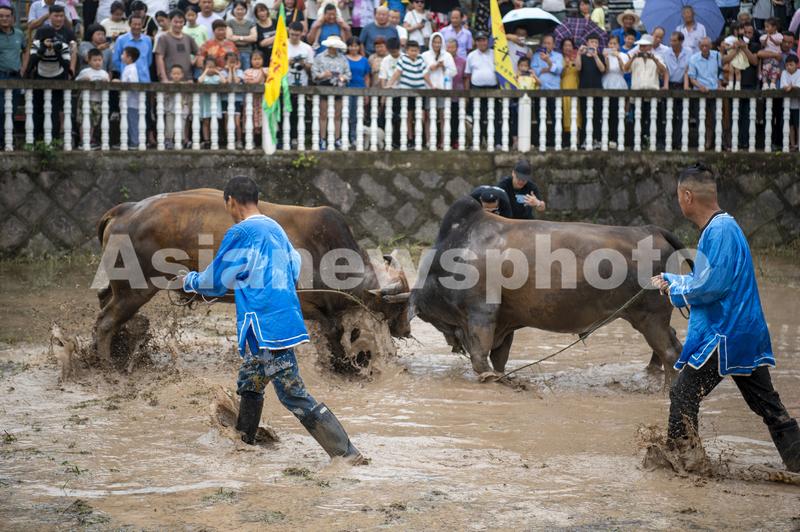 图片说明:2023年6月22日,浙江省金华市婺城区雅畈镇铜山斗牛场里,在阵阵呐喊和锣鼓声中,两头黄牛四角相抵,奋力争斗。