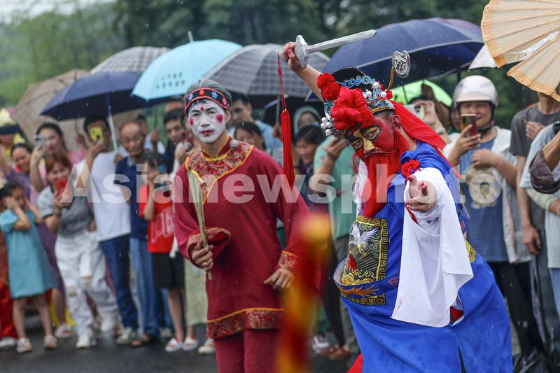 图片说明:2023年6月22日,民俗艺人在黄山市徽州区岩寺镇上朱村表演非遗民俗“跳钟馗”。