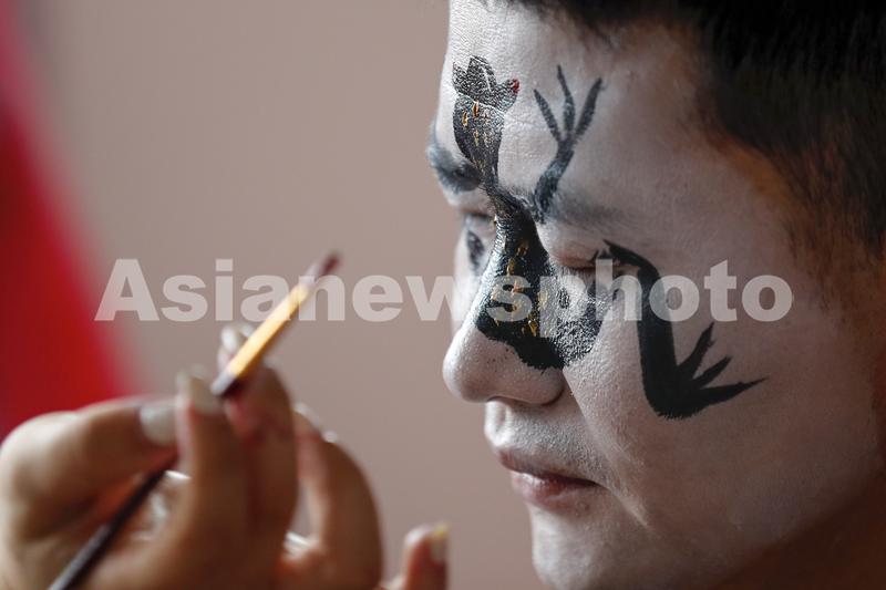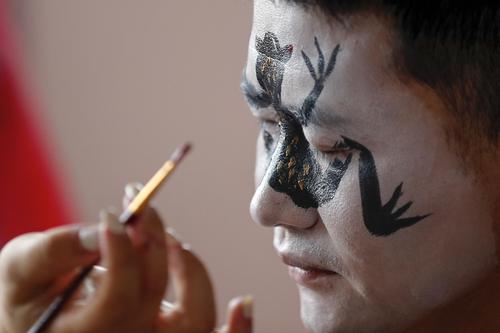 图片说明:2023年6月22日,黄山市徽州区岩寺镇上朱村,民俗艺人在表演前化妆。