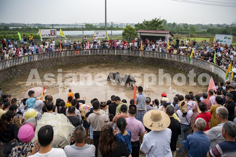 图片说明:2023年6月22日,浙江省金华市婺城区雅畈镇铜山斗牛场里,在阵阵呐喊和锣鼓声中,两头黄牛四角相抵,奋力争斗。