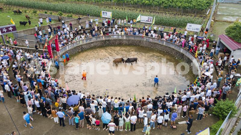 图片说明:2023年6月22日,浙江省金华市婺城区雅畈镇铜山斗牛场里,在阵阵呐喊和锣鼓声中,两头黄牛四角相抵,奋力争斗(无人机照片)。