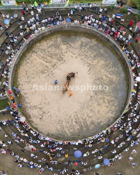 图片说明:2023年6月22日,浙江省金华市婺城区雅畈镇铜山斗牛场里,在阵阵呐喊和锣鼓声中,两头黄牛四角相抵,奋力争斗(无人机照片)。