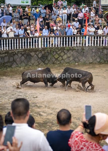 图片说明:2023年6月22日,浙江省金华市婺城区雅畈镇铜山斗牛场里,在阵阵呐喊和锣鼓声中,两头黄牛四角相抵,奋力争斗。