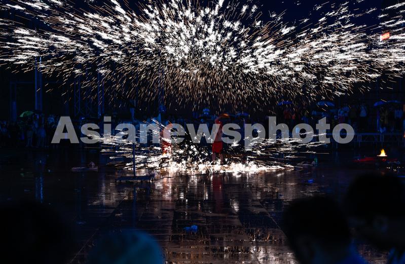 6月23日晚,民间艺人在贵州省黔西南布依族苗族自治州兴义市桔山广场表演“打铁花”。