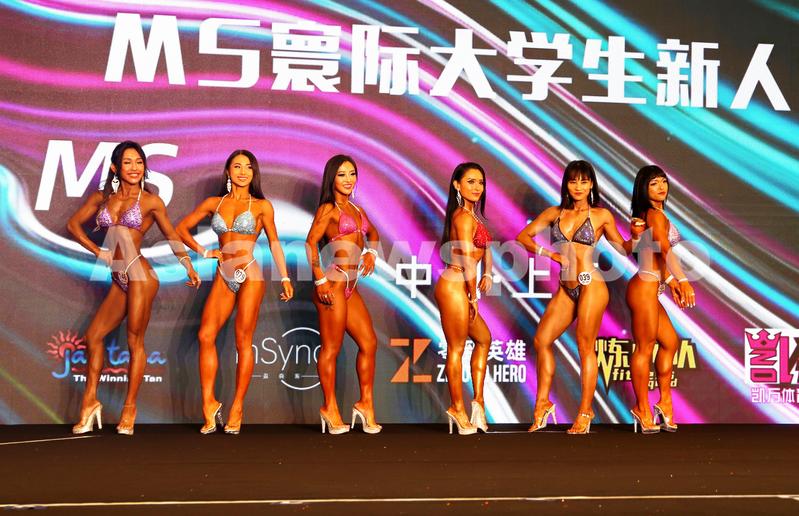 2023年6月25日,上海IWF国级健身展上,参加大学生健美新人赛的比基尼美女展露健康身材和自信笑容。