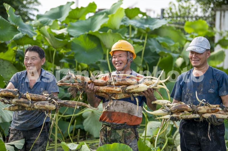 2023年6月25日,浙江省金华市农科院种植基地里,工作人员手捧刚刚出泥的“东河早藕”青荷藕,喜获高产。
