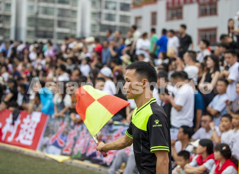 图片说明:2023年6月23日,一名边裁在贵州省榕江县“村超”足球比赛现场执法。