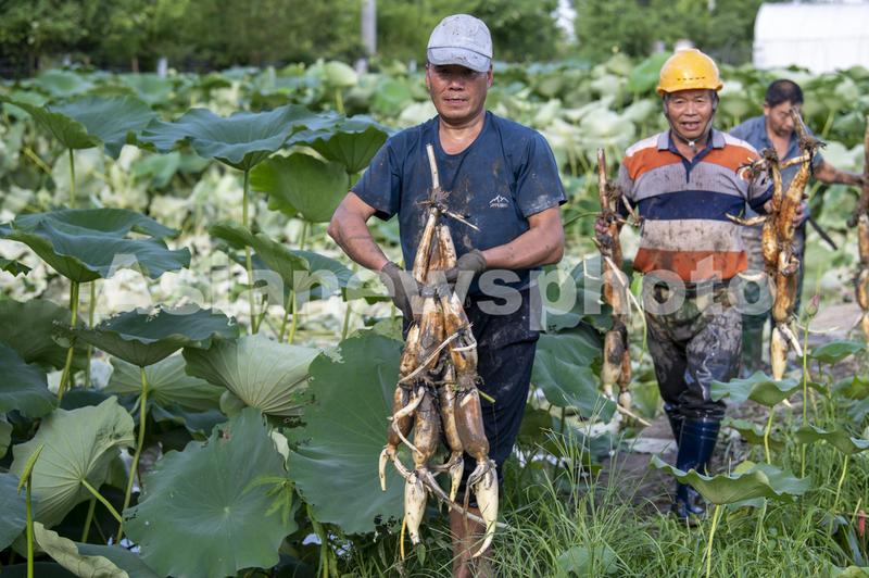 6月25日,浙江省金华市农科院种植基地里,工作人员手提刚刚出泥的“东河早藕”青荷藕上岸。