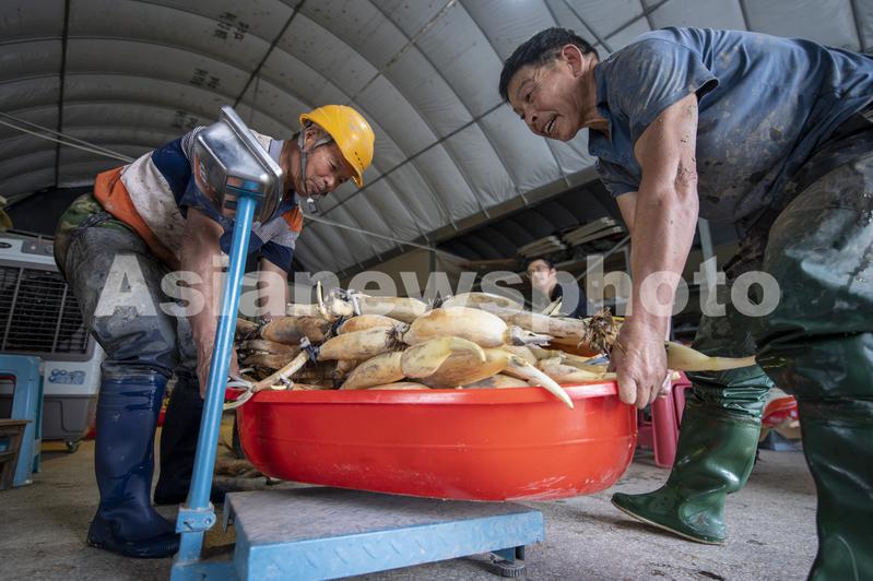6月25日,浙江省金华市农科院种植基地里,工作人员在测产“东河早藕”青荷藕。