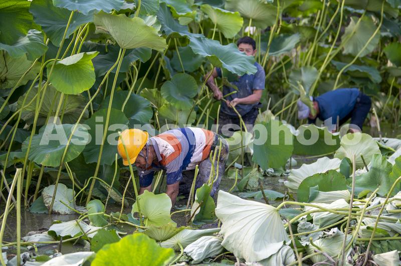 6月25日,浙江省金华市农科院种植基地里,工作人员在拔“东河早藕”青荷藕。