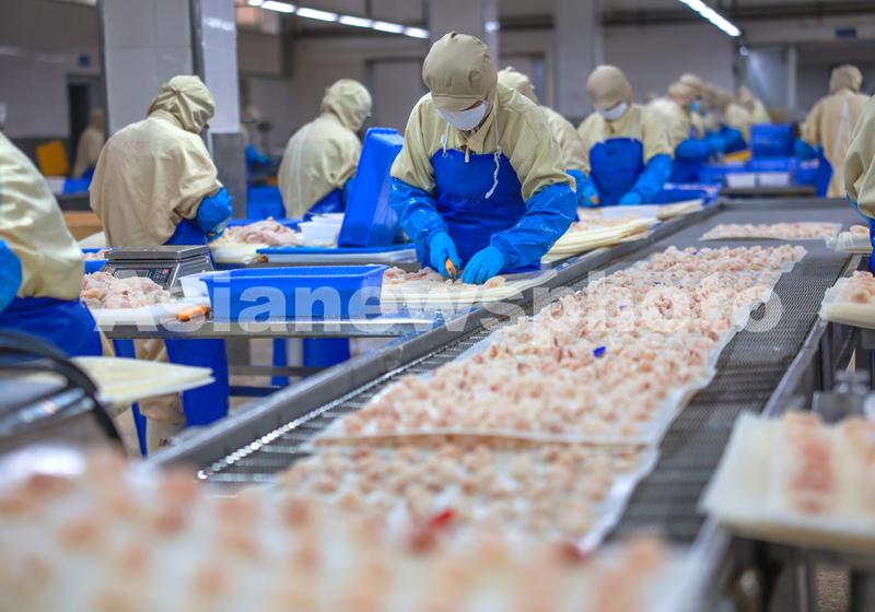 2023年6月27日,在山东省荣成市俚岛镇工业园区一家水产品出口加工企业的生产车间内,产业工人在加工鳕鱼系列制品。