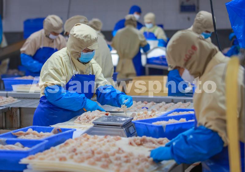 2023年6月27日,在山东省荣成市俚岛镇工业园区一家水产品出口加工企业的生产车间内,产业工人在加工鳕鱼系列制品。