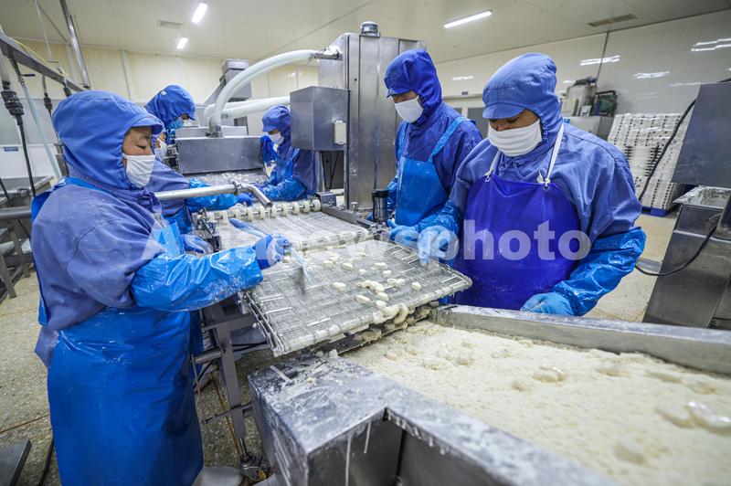 2023年6月27日,在山东省荣成市俚岛镇工业园区一家水产品出口加工企业的生产车间内,产业工人在流水线上忙碌着,加工出口国外的鳕鱼系列预制菜产品。荣成市是全国重要的水产品预制菜加工进出口集散地,现有水产品预制菜加工出口企业100多家。