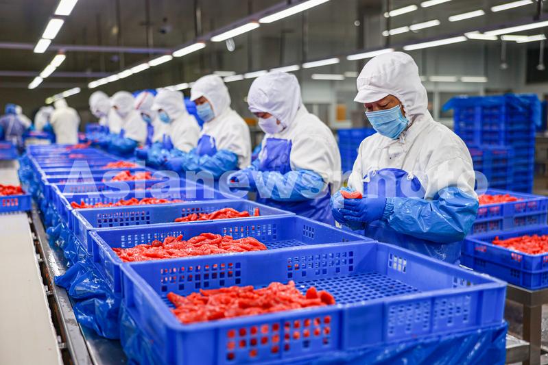 2023年6月27日,在山东省荣成市俚岛镇工业园区一家水产品出口加工企业的生产车间内,产业工人在流水线上忙碌着,加工出口国外的鳕鱼系列预制菜产品。荣成市是全国重要的水产品预制菜加工进出口集散地,现有水产品预制菜加工出口企业100多家。