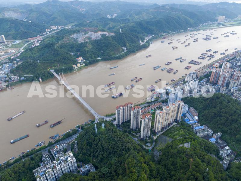 图片说明:2023年6月28日,在广西梧州市区西江段水域,众多货轮来来往往,一派繁忙景象。