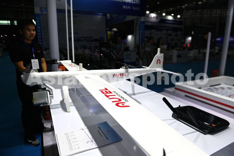 图片说明:2023年6月28日,山东青岛世纪博览城,参展商展示的新型无人机。