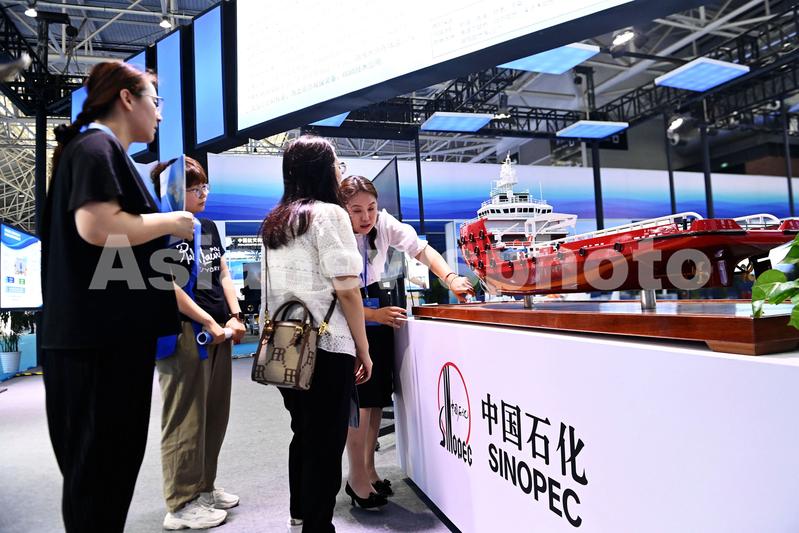 图片说明:2023年6月28日,山东青岛世纪博览城,参观者在中国石化海洋工程展台前参观。