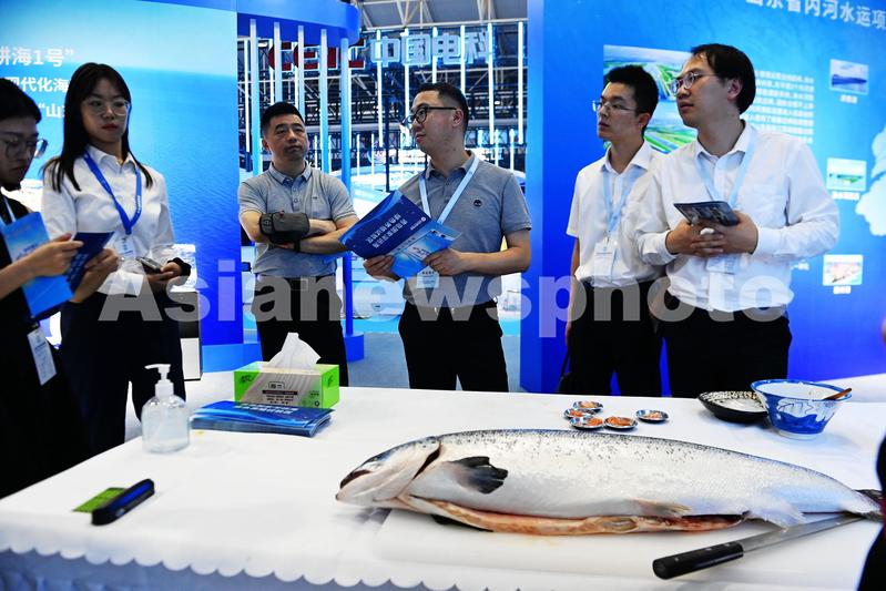 图片说明:2023年6月28日,山东青岛世纪博览城,参观者在听取深海养殖情况介绍。