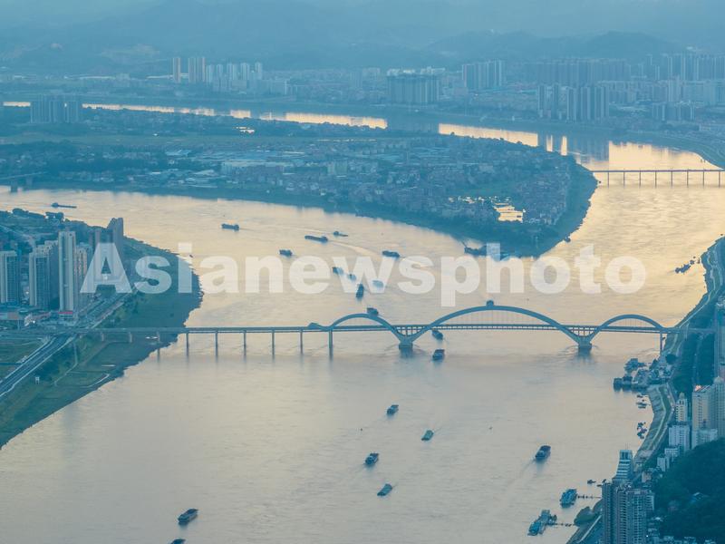 图片说明:2023年6月28日,在广西梧州市区西江段水域,众多货轮来来往往,一派繁忙景象。