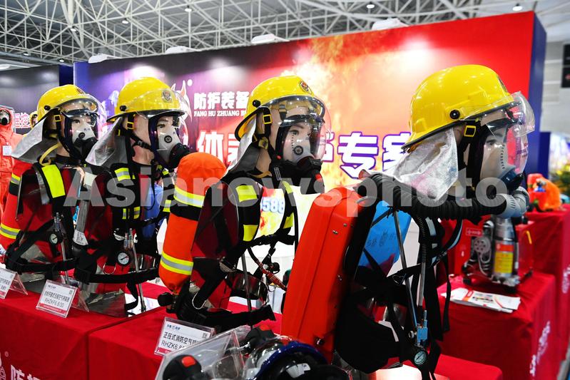 图片说明:2023年6月28日,山东青岛世纪博览城,参展商展示的消防防护装备。