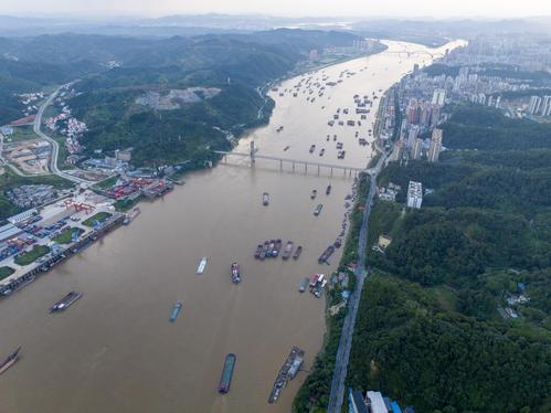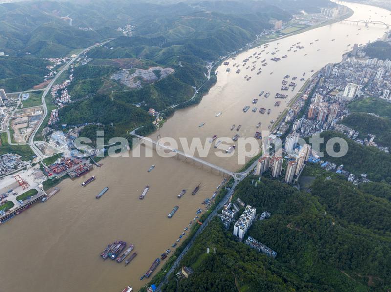 2023年6月28日,在广西梧州市区西江段水域,众多货轮来来往往,一派繁忙景象。