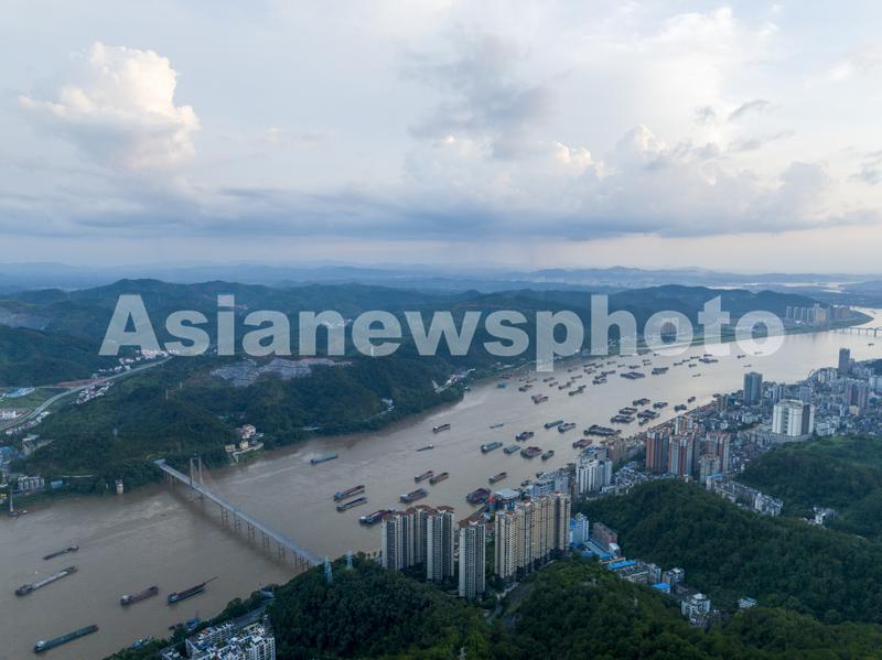 图片说明:2023年6月28日,在广西梧州市区西江段水域,众多货轮来来往往,一派繁忙景象。