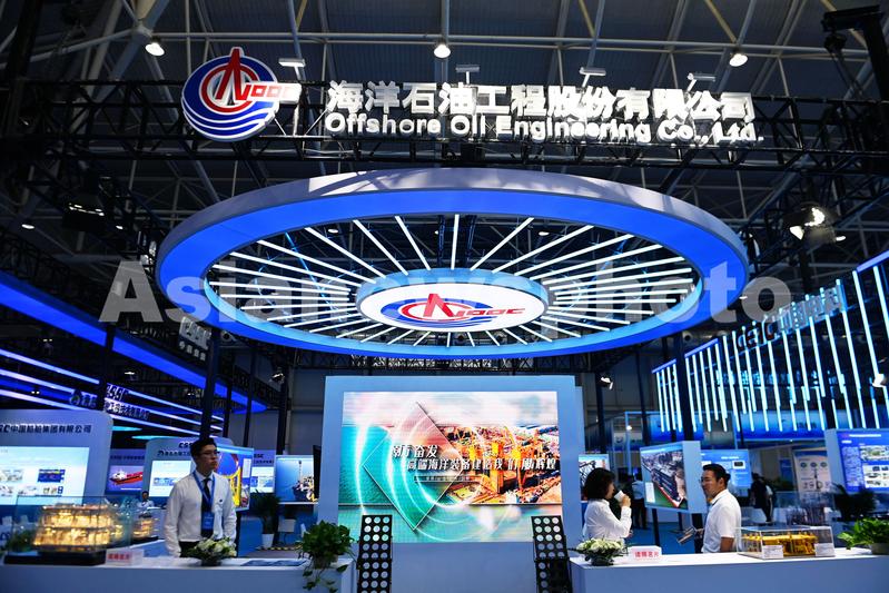 图片说明:2023年6月28日,山东青岛世纪博览城,参观者在海洋石油工程股份有限公司展台前参观。
